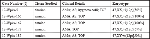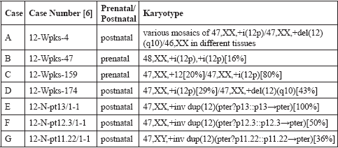 More interesting is, that a variety of karyotypes have been reported in association with PKS, besides the regular ones with 47,+i(12p) and mos 47,+i(12p)/46. Unexpected cytogenetic results are sometimes detected even though the PKS phenotype is clear (Table 2) or there is no sSMC [8]. In PKS with sSMC, more complex mosaics have been reported as in cases A-D of Table 2, including complete trisomy 12 and hexasomy 12p. Three cases (E-G) in Table 2 with neocentric sSMC (12) suggest a possible small PKS critical region in 12pter to 12p13. Thus, additional case reports can be expected to further increase our clinical and cytogenetic understanding of PKS. Nonetheless, to come to an approximate assessment of the frequency of PKS in the general population, also cases with a "typical Tetrasomy 12p" karyotype, should be reported, as the five of the present paper.